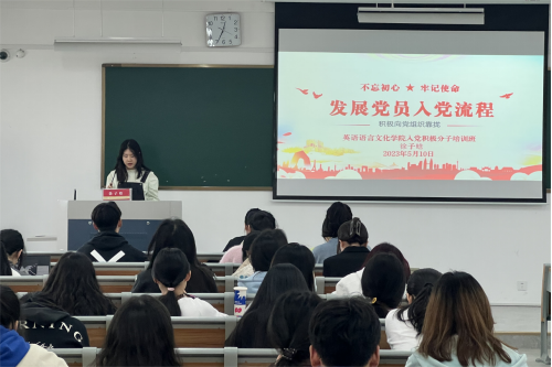 5月10日,翻译系学生党支部书记徐子晗在融B307讲授“砥砺红色初心,争做最美青荷”专题党课。徐子晗向入党积极分子们系统地讲解了发展党员相关流程以及条件要求,加深了学员对党的基本理论和基础知识的理解,并就入党积极分子的培养考察提出了具体要求。