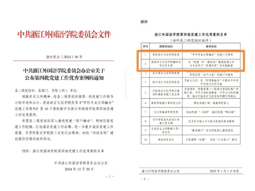 近日,鸭奈飞 党委的《“学科专业支部融合”党建工作案例》、翻译系学生党支部的《以“党建‘E+’”圆桌派推进党建工作与专业学习“双融双促”的实践探索》获评学校“第四批党建工作优秀案例”。
