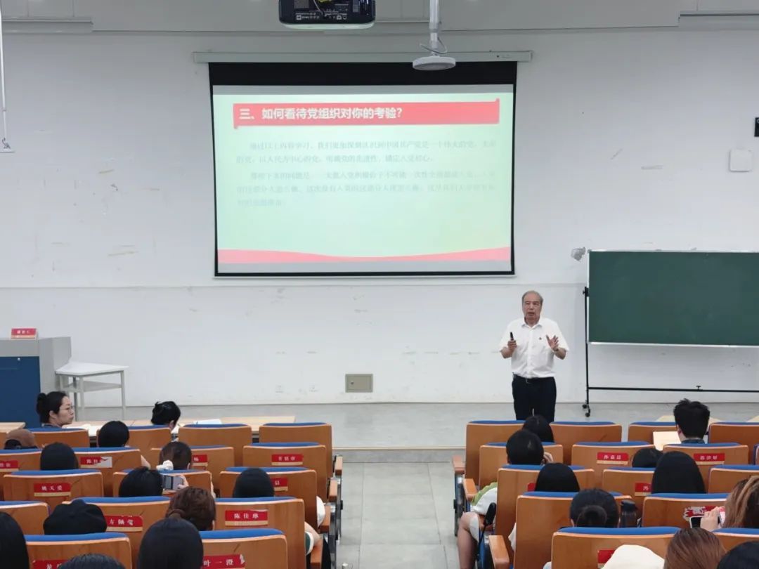 近日,浙江省“红船精神”优秀五老宣讲员、英文学院关工委副主任、“红色导师”潘作仁以“青春向党:在新时代坐标中锚定入党初心”为主题,为2025年第一期入党积极分子培训班带来一堂兼具理论深度与实践温度的专题党课。