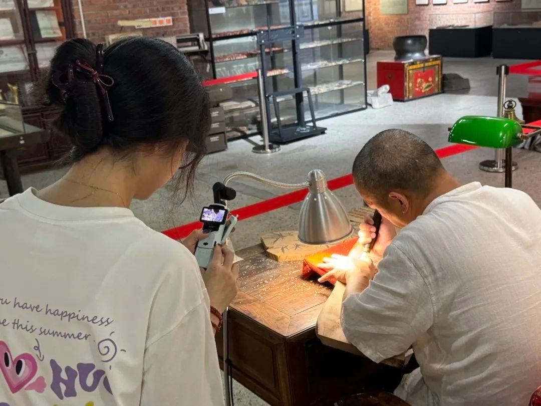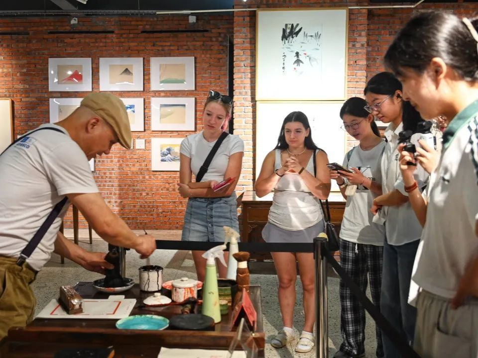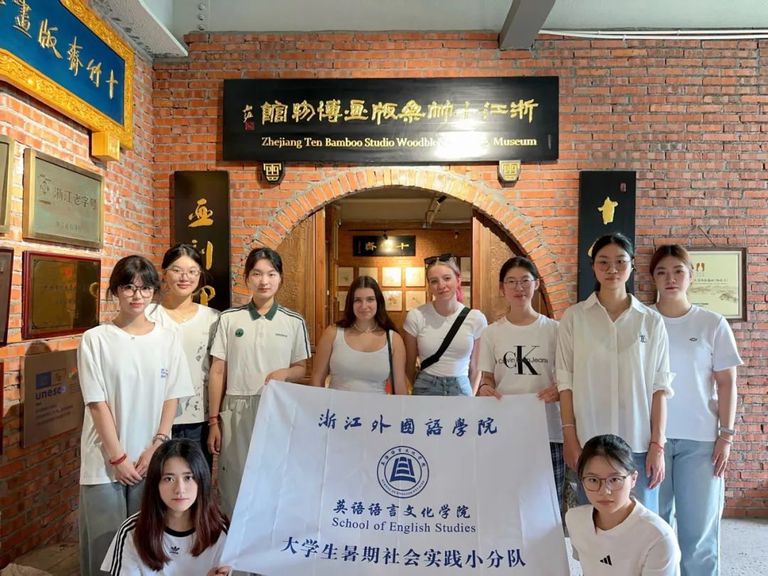 除了实地学习非遗技艺,同学们还积极发挥专业优势,拍摄系列双语宣传视频,用镜头记录非遗文化的独特魅力,以流利的英语向世界讲述中国故事,将非遗文化的精髓传递给更多的人。镜头追随着他们的脚步走过博物馆、展览馆、制作工坊,也倾听来自不同国家和地区的人们对于中国非遗文化的看法。“非同'译'般”浙江外国语赴杭州十竹斋实践团的成员采访到了一位来自美国密苏里南方州立大学的学生:“木板水印是一种很美的艺术,是一种很美的文化,我很开心今天能去博物馆体验木板水印,我也希望更多人能知道这种艺术和文化。”