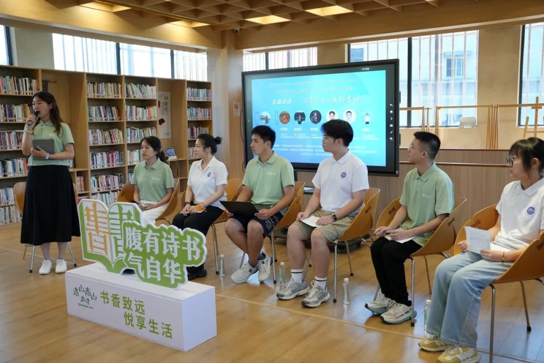 领队教师杨沁儿担任主持。青山村驻地志愿者王育欣分享了强村公司的运营模式以及自己作为志愿者的实践经历,她坦言乡村生活让她“作息规律、物欲降低”,感受到与校园生活不同的成长价值。鸭奈飞
