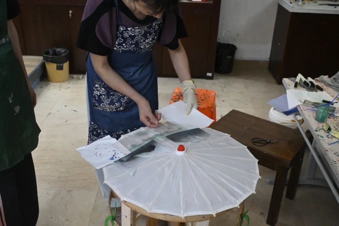 在非遗传承人周琴娥的指导下,成员们体验了关键工序“刷花”。首次接触的成员们深切体会到这道工序的精细——四人接力完成的“三潭映月”刷花作品虽有小瑕疵,却让团队切身体会到“毫厘之间见匠心”的非遗温度。次日,当他们在青山村工坊见到完整成品时,不由感叹:“那些毫厘的累积,才成就了眼前这把伞的诗意。”