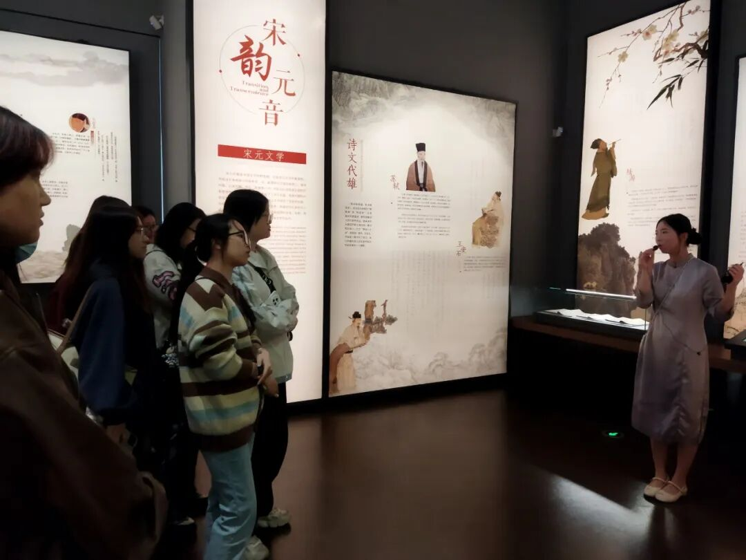 每一个文学故事都让同学们驻足,或低头记录,或轻声交流,指尖偶尔掠过展墙上的诗句,仿佛与百年前的文人墨客完成了一场跨越时空的对话。