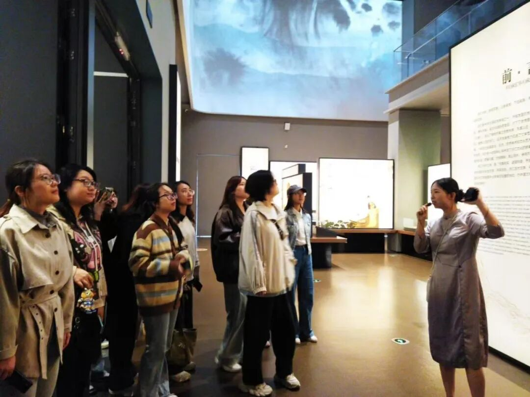 在两位讲解员的引导下,23级翻译专业的同学们有序进入场馆。讲解过程中,讲解员结合展陈内容,生动讲述了浙江文学从吴越时期的源头起步,历经唐宋诗词的兴盛、明清小说的繁荣,再到现当代文学蓬勃发展的漫长历程。