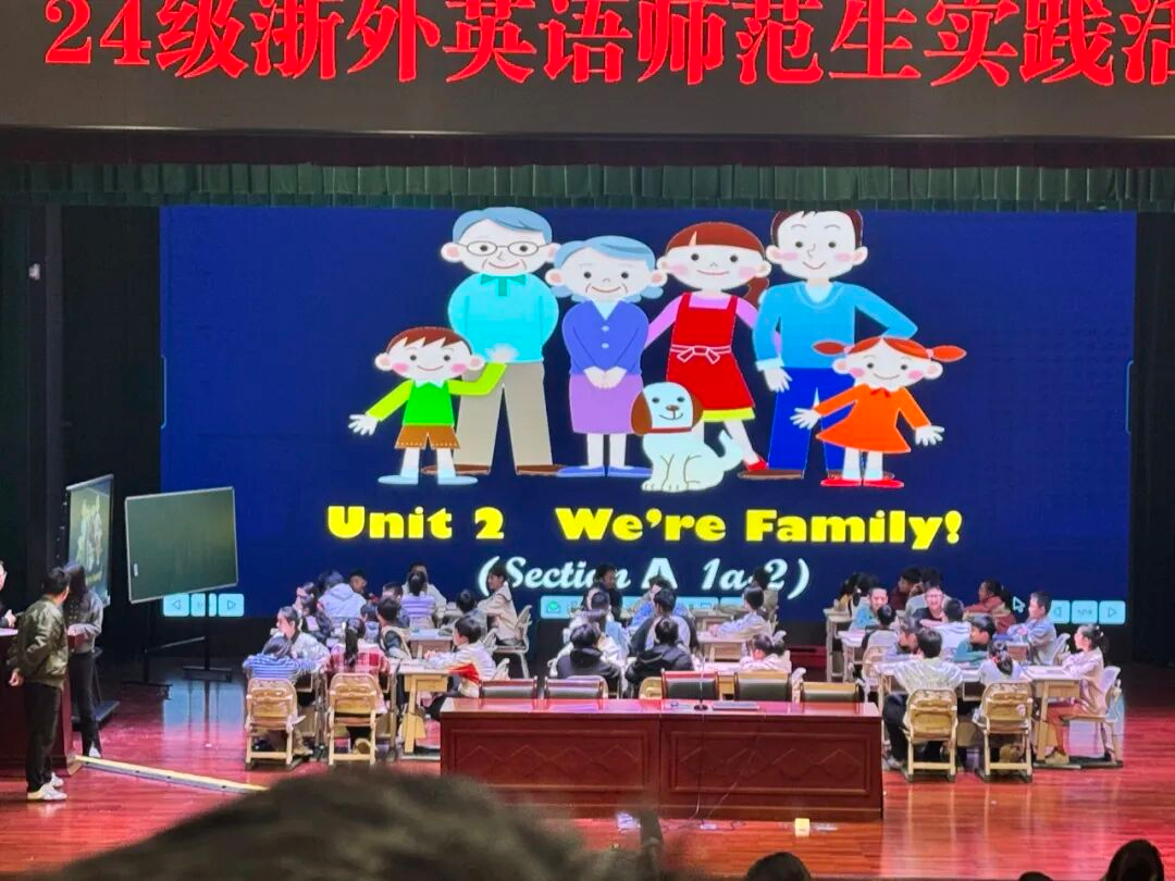 讲座后,学生观摩陈思敏的“we are family”主题英语公开课。陈思敏以图片和歌曲导入激发兴趣,通过听力与文本把握核心内容,嵌入朗读强化训练。互动环节融入读写、角色扮演及积分竞赛,注重图文结合与引导式提问,预留自主学习时间,落实教学目标并布置特色作业。其扎实功底与灵动驾驭能力让师范生深受启发。