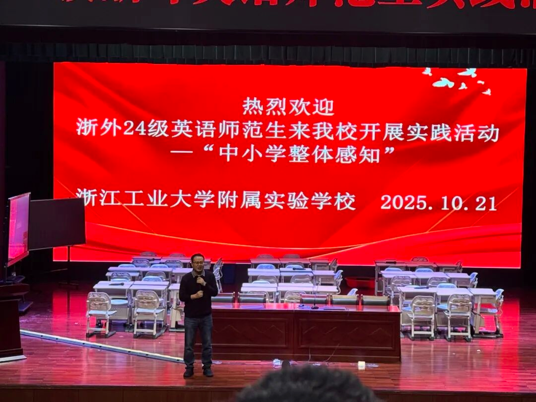 外语教育系教学主管韩丹带领学院24级英语(师范)专业学生走进浙江工业大学附属实验中学开展研学实践。浙江工业大学附属实验中学校长方浩,高级教师张红梅,教师陈思敏带领同学开展研学活动。两校深厚渊源为活动筑牢根基、搭建交流桥梁。