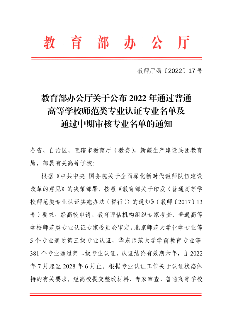 近日,教育部办公厅公布了2022年通过普通高等学校师范类专业认证专业名单及通过中期审核专业名单,我院英语专业成功通过2022年普通高校师范类专业第二级专业认证。认证结论有效期六年,自2022年7月起至2028年6月止。