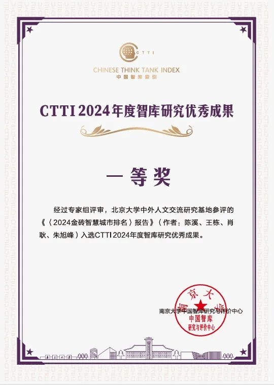 特聘教授陈溪牵头完成的《〈2024 阿盟智慧城市排名〉报告》《〈2024 金砖智慧城市排名〉报告》分获 CTTI(中国智库索引)2024年度智库研究优秀成果特等奖、一等奖。此前,陈溪教授于去年牵头完成的《2023亚洲智慧城市排名》和《2023二十国集团智慧城市排名》也荣获CTTI 2023年度智库优秀成果特等奖。
