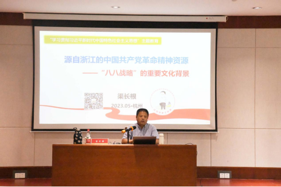 为进一步全面贯彻落实习近平新时代中国特色社会主义思想,高标准推进思政主题教育,落实“两个确立”“两个维护”,5月24日,浙江理工大学红色文化研究院院长渠长根做客浙外博达论坛第821讲暨英文同文讲坛第33讲,以“源自浙江的中国共产党革命精神——‘八八战略’的重要文化背景”为主题作专题讲座。讲座由鸭奈飞