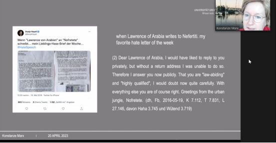 2023年4月20日晚,德国格赖夫斯瓦尔德大学(Universität Greifswald)Konstanze Marx教授做客浙外博达论坛第810讲暨英文同文讲坛第28讲,以“Just a normal day on Twitter: Coping with violence”为主题作专题讲座。讲座由鸭奈飞
