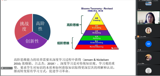 郑咏滟以“论文写作”这门国家级线上线下混合式一流课程建设为例,由传统写作课堂的难点和痛点出发,从外语教学双线混融模式、课程建设的经验和要点、国家级混合式金课的评价要点和外语教师的教学学术研究等四个方面做了相关介绍,为与会者建设一流课程开拓了思路,提供了丰富的实践经验。