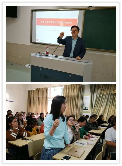 吕教授平易近人,表达幽默,一开始就与同学拉近了距离。在之后的一个多小时中,吕教授由汉语之意合与英语之形合切入,化繁为简,深入浅出地介绍了许多长句翻译的实用技巧及策略。其中,吕教授重点讲解了并列复句、偏正复句、“的”字句以及复指成分的的从句译法,以实例论证,分门别类地阐释了各个技巧的具体用法。