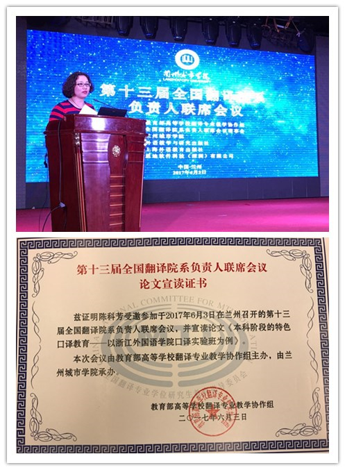 2017年6月2-3日,我院陈科芳教授赴甘肃省兰州市参加由教育部高等学校翻译专业教学协作组、全国翻译院系负责人联席会议理事会主办,兰州城市学院外国语学院承办的教育部高等学校翻译专业教学协作组2017 年工作会议暨第十三届全国翻译院系负责人联席会议。来自全国各地80所翻译本科院校负责人、兰州各高校外国语学院负责人及赞助企业代表共200余人出席会议。