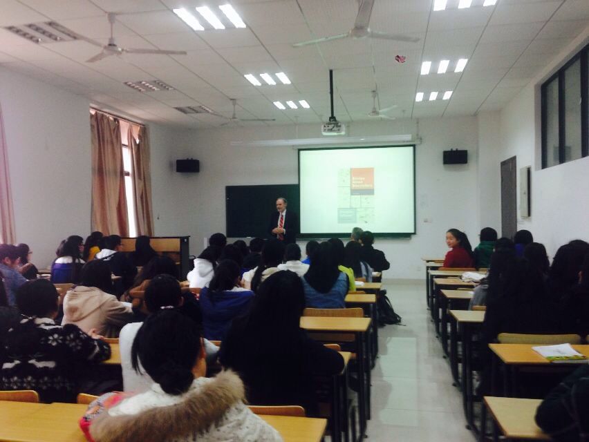 2015年3月27日下午,浙江外国语小和山校区艺术楼A508济济一堂。加拿大McClelland & Stewart出版社原社长、主编、幽默作家Mr. Douglas Gibson 为我校师生分享了自己编书、审稿、做书、写书的宝贵经验,和众多当代加拿大作家的交往、发现,并着重介绍了自己与去年的诺贝尔文学奖得主爱丽丝·门罗的之间的协作和文学趣事。他富于见地,当众多编辑鼓励门罗写长篇,导致门罗陷入文思枯竭时,他坚定地鼓励门罗写短篇,编辑并发表门罗的所有作品,他以自己的见地、热情、真诚赢得了众多作家,团结了一大批作家在自己的周围。之后他将自己的故事写成幽默小品文《关于故事家的故事》,倍受欢迎。