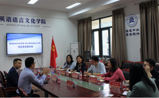 洽谈校企合作方案,学院党总支书记毛立峰、党总支副书记张豫晋、英语系主任黄艳春、商务英语系主任陆海霞、学工办辅导员张伟俊、吴小慧参加座谈会。