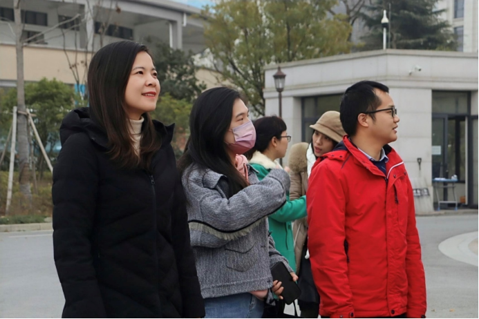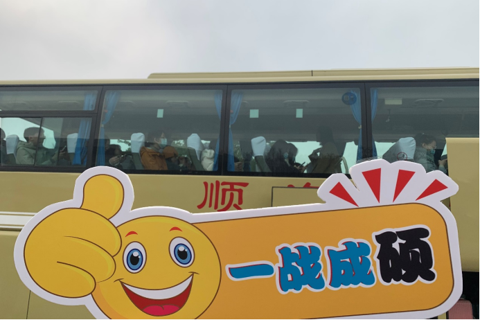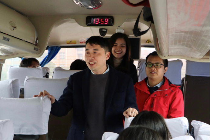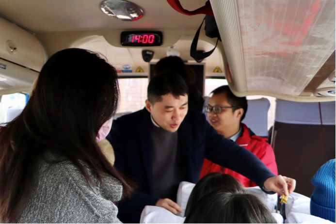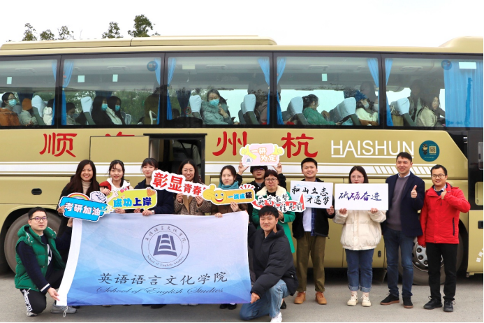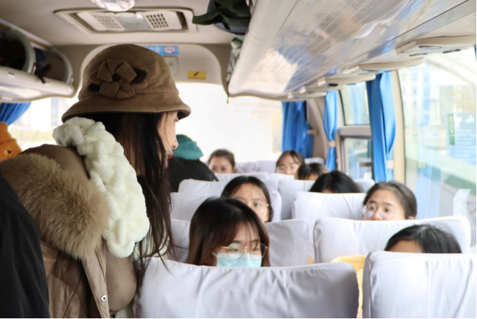 54名考生乘上学院准备的送考大巴前往考点,学院领导班子、毕业班班主任、学生辅导员以及学生代表来到现场为考生们加油助威。