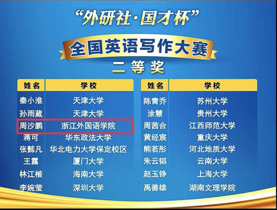 据悉,“外研社·国才杯”全国英语写作大赛由外语教学与研究出版社、教育部高等学校大学外语教学指导委员会、教育部高等学校英语专业教学指导分委员会、中国外语教育研究中心联合举办。大赛历经多年有序开展,已形成高度成熟的竞赛模式,在全国高校有较强影响力。是全国优秀学子竞技英语表达与沟通艺术的交流平台,为大学生提供了展示外语能力、沟通能力和思辨能力的良好机会。