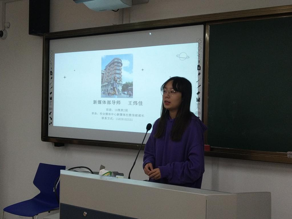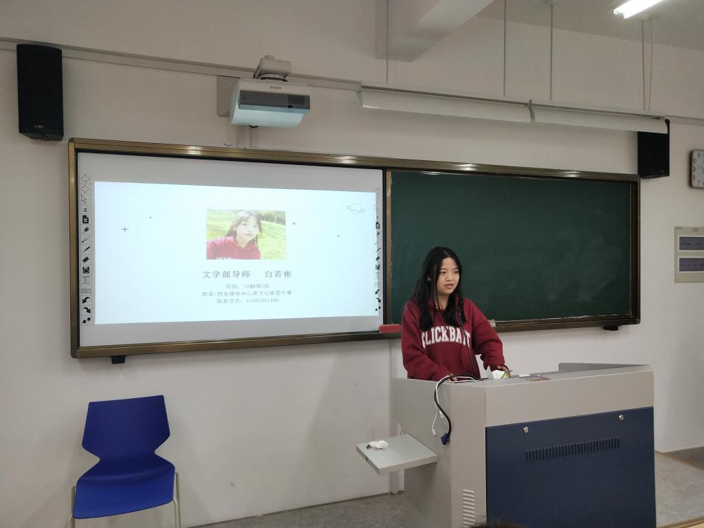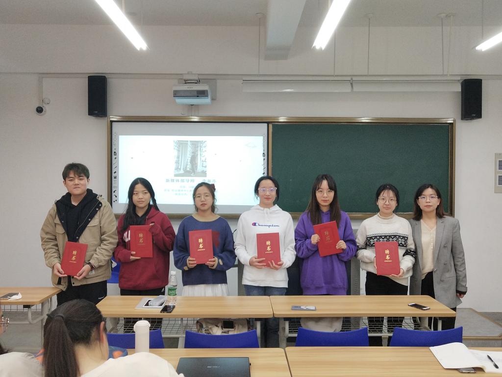 本学年,鸭奈飞特聘校全媒体记者团的白若彬、黄暖,视觉传达中心的黄国秦、袁敏君以及新媒体社的王炜佳、季秦亦等同学为各部门进行指导。