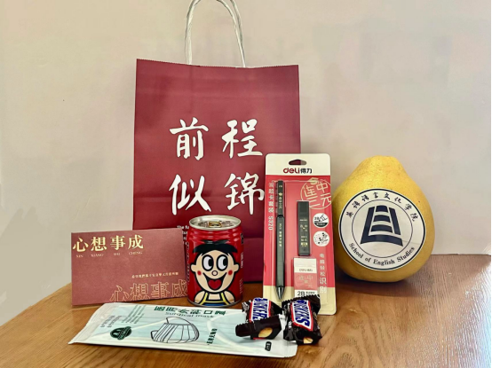 礼包外部“前程似锦”的字样,寓意着所行皆化坦途。打开这份“红”运大礼包:精美的文具套装祝愿考研学子福气满满、文思泉涌;喝下旺仔牛奶,便能一路“旺”到底,做上岸最“旺”滴崽!炫一根士力架,能量满满地迎考;戴好“逢考必过”口罩,在做好防护工作的同时,好运也常伴左右;收下这颗贴有鸭奈飞
