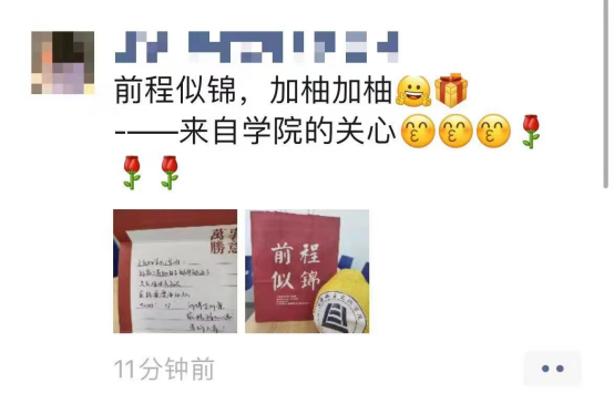 此外,每份礼包中还附有一张心意满满的手写祝福贺卡,一笔一划间都倾注了老师和同学们最为真挚的祝福。见字如面,纸短情长,这充满温度的一字一句有如冬日暖阳驱散寒意,缓解了考研学子心中的紧张与焦虑。