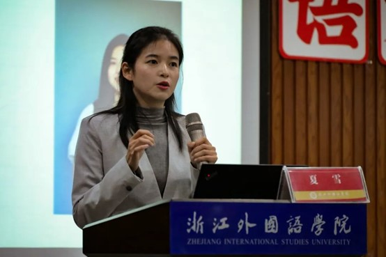 夏雪用“你对英语专业未来前景持何种态度”发问,借助自身的例子和大数据,引出了对英语专业学生就业大环境的分析。她指出,英语相关专业领域的机会较多,但能够在不同领域用英语进行有效沟通的复合型国际化人才在市场上却十分少,这批人才正是中国发展的急需的稀缺资源。