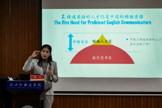 她介绍了成为复合型人才的制胜之道——掌握“英语+”的能力,例举了Englis+PR/Advertising/Communciation和English+E-commerce等具体案例,鼓励大家在掌握专业技能的同时,尝试跨学科组合,跳出传统思维;巧妙利用语言带来的信息差优势,探索新的发展道路。