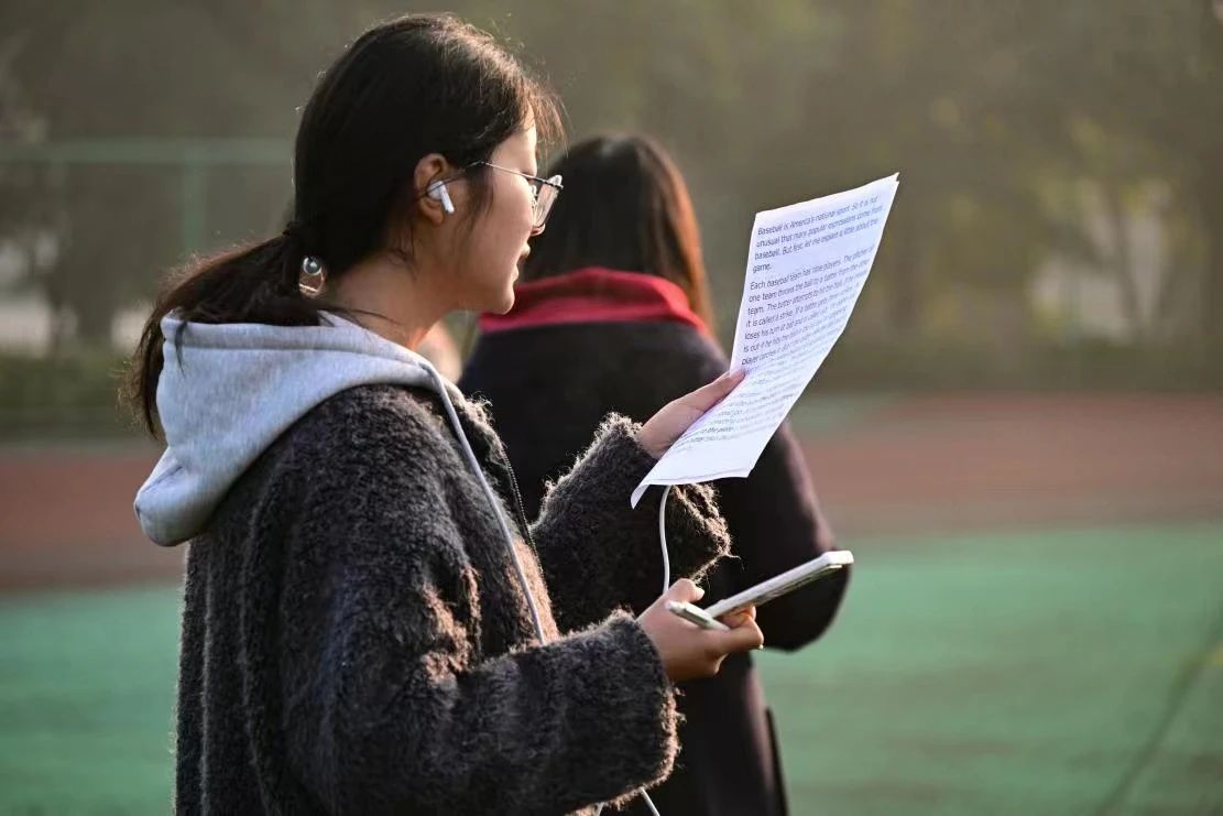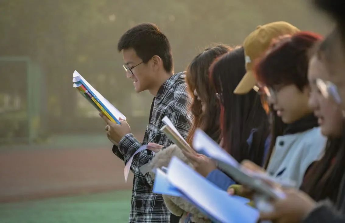 晨跑结束后,在新生晨读学生助教陈海涵的带领下,同学们迎着朝阳,以最饱满的状态开启了晨读。他们目光专注,放声诵读。朗朗读书声传遍操场的每一个角落,展现出英文莘莘学子的求学之勤、成长之志。