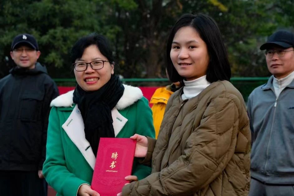 副院长郑淑贞给最强“英”晨跑队第一任队长张俞如颁发聘书。