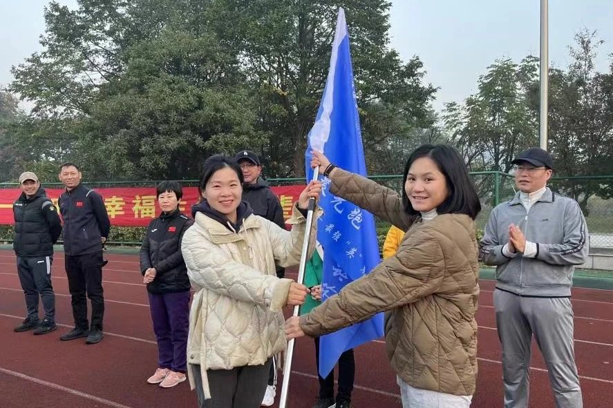 学院党总支书记田俊杰向晨跑队授予队旗。