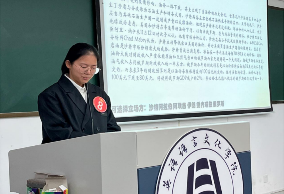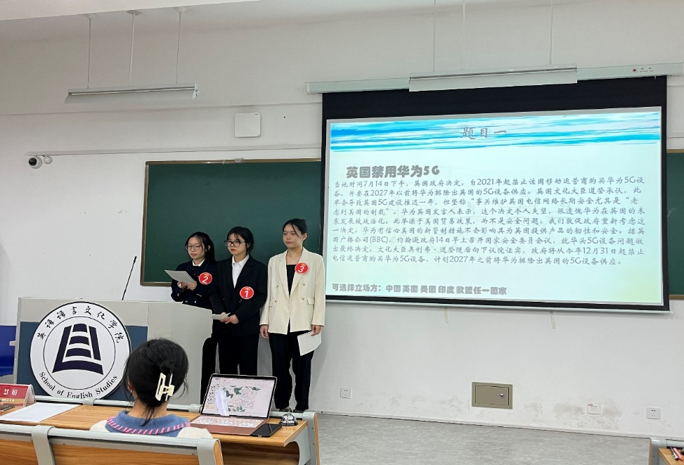 各组在赛前抽取一则时事新闻材料,经10分钟讨论后由一位代表复述新闻、阐述己方立场观点(限时3分钟)。