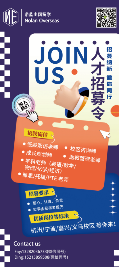诺蓝出国教育是一所具有高度国际化特色的出国留学和培训机构,创办于2010年,十四年致力于培训国际化英才,致力于高校和国际高中学生雅思、托福、A-Level、SAT、SSAT、ACT小班和一对一语言和学科的个性化定制培训以及高精度的留学咨询服务。与浙江省多所高校和多所优质国际高中深入合作,并被指定为合作培训机构,生源来自浙江大学、中国计量大学、浙江财经大学、浙江工商大学、浙江传媒学院、宁波大学、宁波诺丁汉大学等多所高校,和上海领科国际学校、上海上实剑桥、杭州人大附中、杭州育澜剑桥、海亮教育、宁波效实中学国际班、镇海中学剑桥班等。已输送众多学生去往牛津大学、帝国理工学院、南加州大学、杜克大学、约翰霍普金斯大学、悉尼大学等世界顶级高等学府深造。经过十四年的发展,高通过、高口碑、精服务是众多学生对本机构培训的评价。