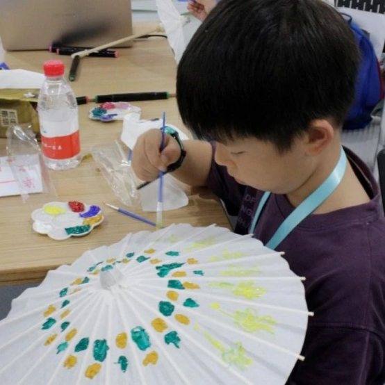 “老师老师!你看我画的油纸伞好看吗?”“老师!下一步怎么做呀!”在非遗体验课上,小朋友们积极动手,尝试了杭州油纸伞、竹编种子画、植物拓印、中国结制作等手工活动。小朋友在感叹非遗制品精致美丽的同时,发现了古人技艺之巧思,体会到了传统文化蕴含的精髓。浙外团队成员采用“理论+实践”模式,在输出非遗传统优秀文化知识、渗透思政理念后鼓励同学们亲手制作,让小朋友们于玩中学,于学中玩,有所思、有所悟、有所得,进一步理解非遗技艺的特色内涵,从而传承中华优秀传统文化。