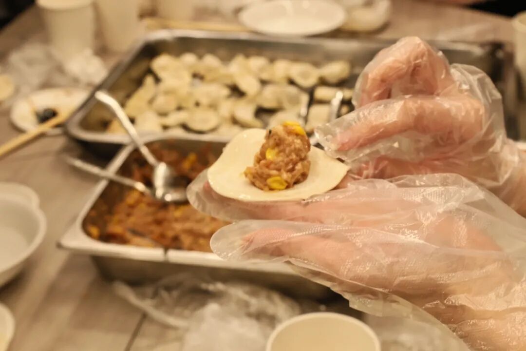 讲解结束后,早已准备好的饺子材料被一一端上桌,现场立刻热闹起来。同学们自发围聚桌边,共同学习饺子的制作。现场氛围热烈又温馨,擅长包饺子的同学主动化身“民间师傅”,手把手传授技艺:取一张饺子皮,在掌心放平,放馅料,讲究“不多不少”,少了则饺子干瘪,多了则难以封口,“老师”们一边示范一边叮嘱,还不忘分享自家包饺子的小诀窍。留学生们虽然是第一次包饺子,手法还有些生疏,但是学习劲头十足。他们在“老师们”的指导下认真尝试,一边捏褶塑形,一边交流,时而为一个完美的饺子欢呼,时而为不小心“露馅儿”的失误打趣,并围绕美食背后的文化习俗展开热烈讨论,不同民族与文化隔阂在欢声笑语中悄然消融,指尖的技艺传递与心灵的真诚沟通,让跨文化交融变得具体而温暖。