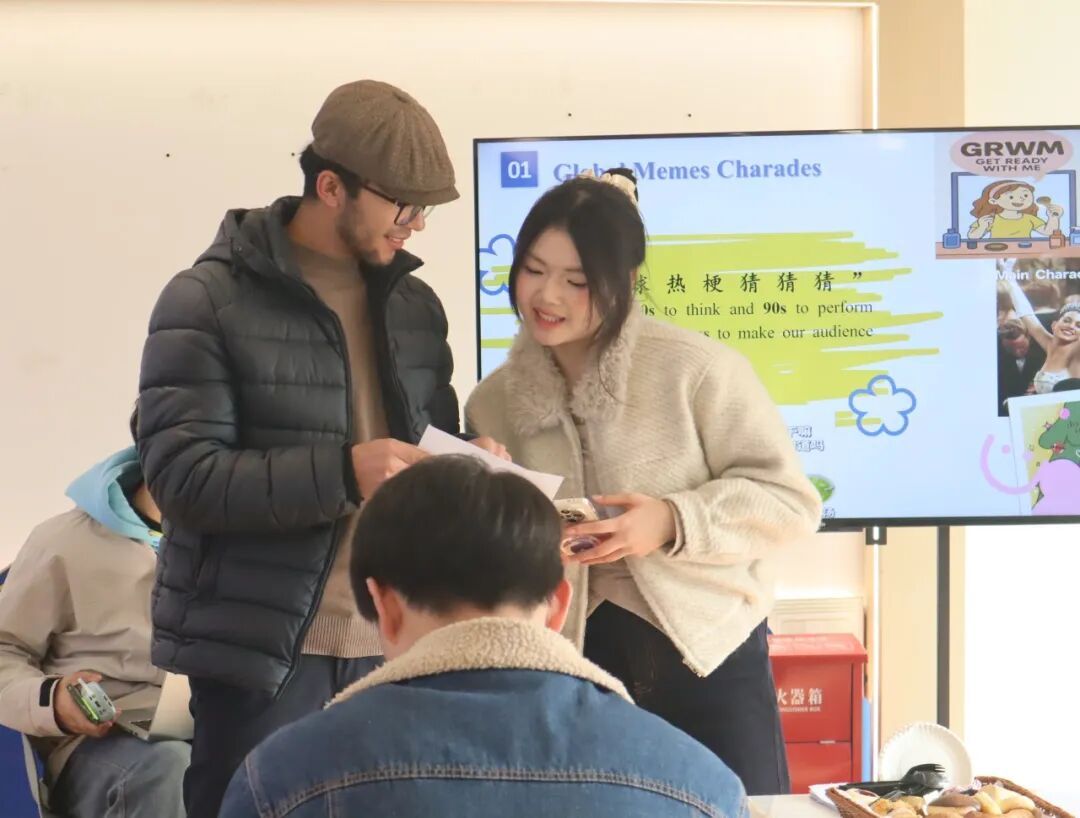 第二十期跨文化交际活动在温馨的“小石光”空间成功举办。本期活动以“从‘热梗’到‘共鸣’——解码短视频里的Z世代情绪”为主题,25级商务英语1班翁梓怡同学主讲,吸引了众多国际友人与鸭奈飞