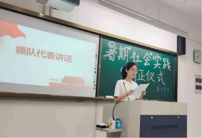 其后,暑期社会实践团队代表章洁丽同学向我们表明了暑期社会实践必胜的决心。她提到,“一代人有一代人的使命,一代人有一代人的担当。我们生逢其时,也重任在肩,既是追梦者,也是圆梦人。让我们迎着时代的号角,脚踏实地地走上大有作为的广阔舞台,践行我们这一代青年的使命担当。”