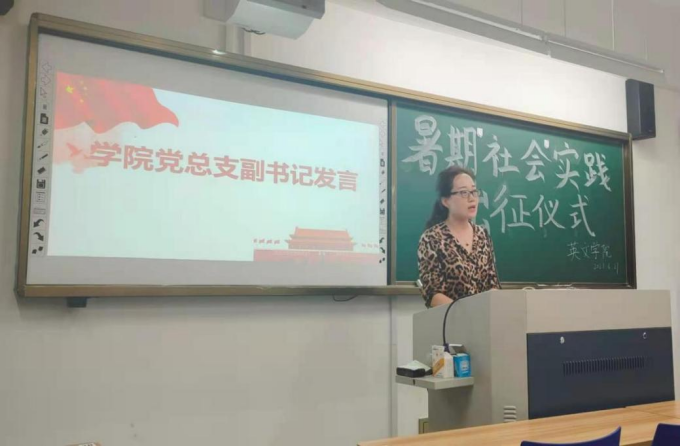 党总支副书记郝菲菲发言,她鼓励同学们认真开展社会实践,希望同学们在社会实践中磨练意志,增长专业才能,提升解决实际问题的能力,践行校训、探求真知,在体验中锻炼才干,在感悟中增长见识。