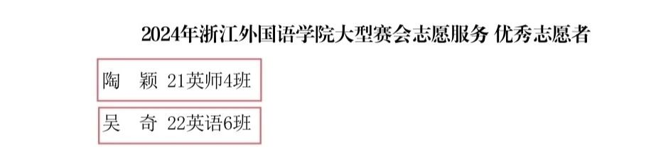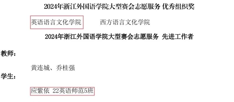 获评2024年度学校大型赛会志愿服务优秀组织奖,22英语师范5班应紫依获评先进工作者,21英语师范4班陶颖、22英语6班吴奇获评优秀志愿者。