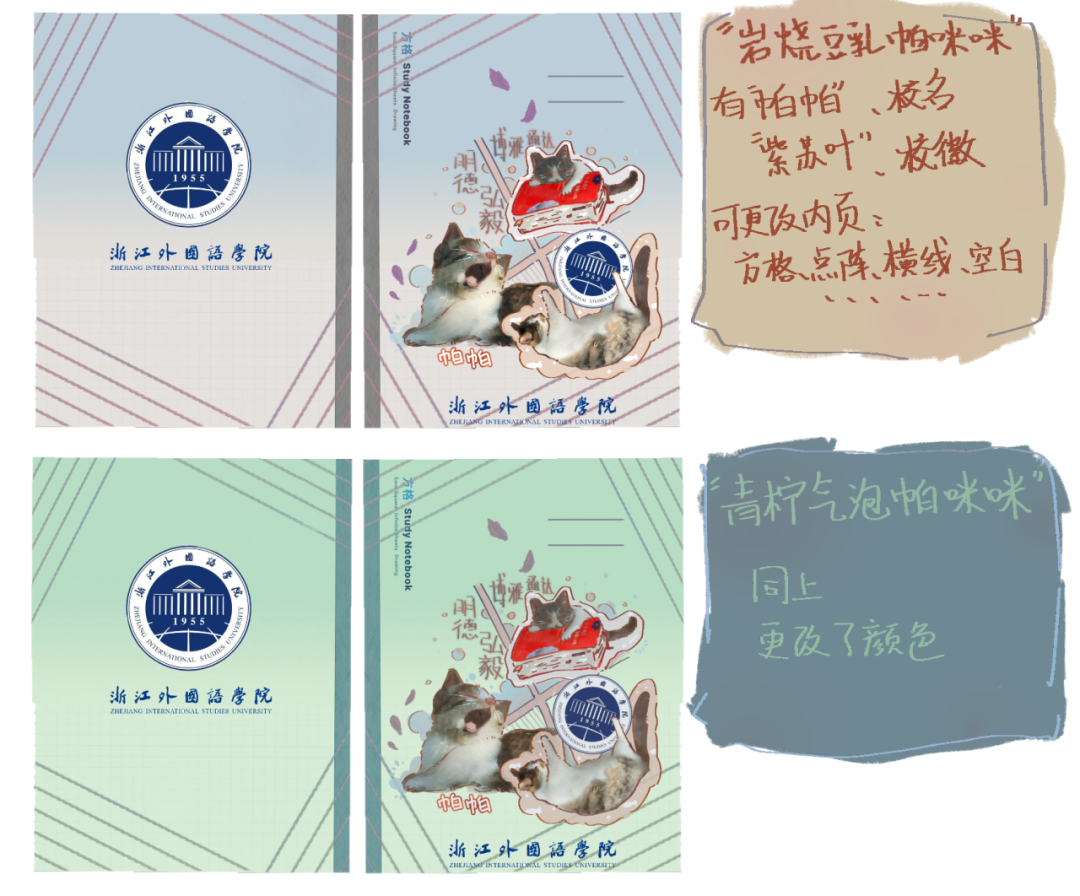 里一只备受喜爱的小猫“帕帕”为设计灵感,结合紫苏叶的意象,旨在创造一个富有教育意义、温馨可爱且实用美观的学习伴侣。通过“帕帕”的形象,我希望传达出智慧、好奇心和探索精神,激励同学们在知识的海洋中勇敢航行。