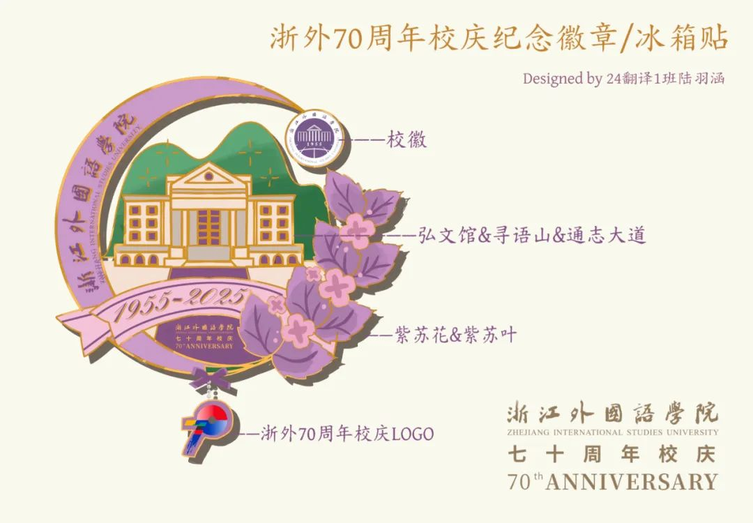 七十周年校庆为契机,紧扣校训“明德弘毅 博雅通达”,以象征学校的紫苏花叶为核心意象,结合典雅紫色与烫金工艺,展示浙外青年青春有为、昂扬向上的精神。