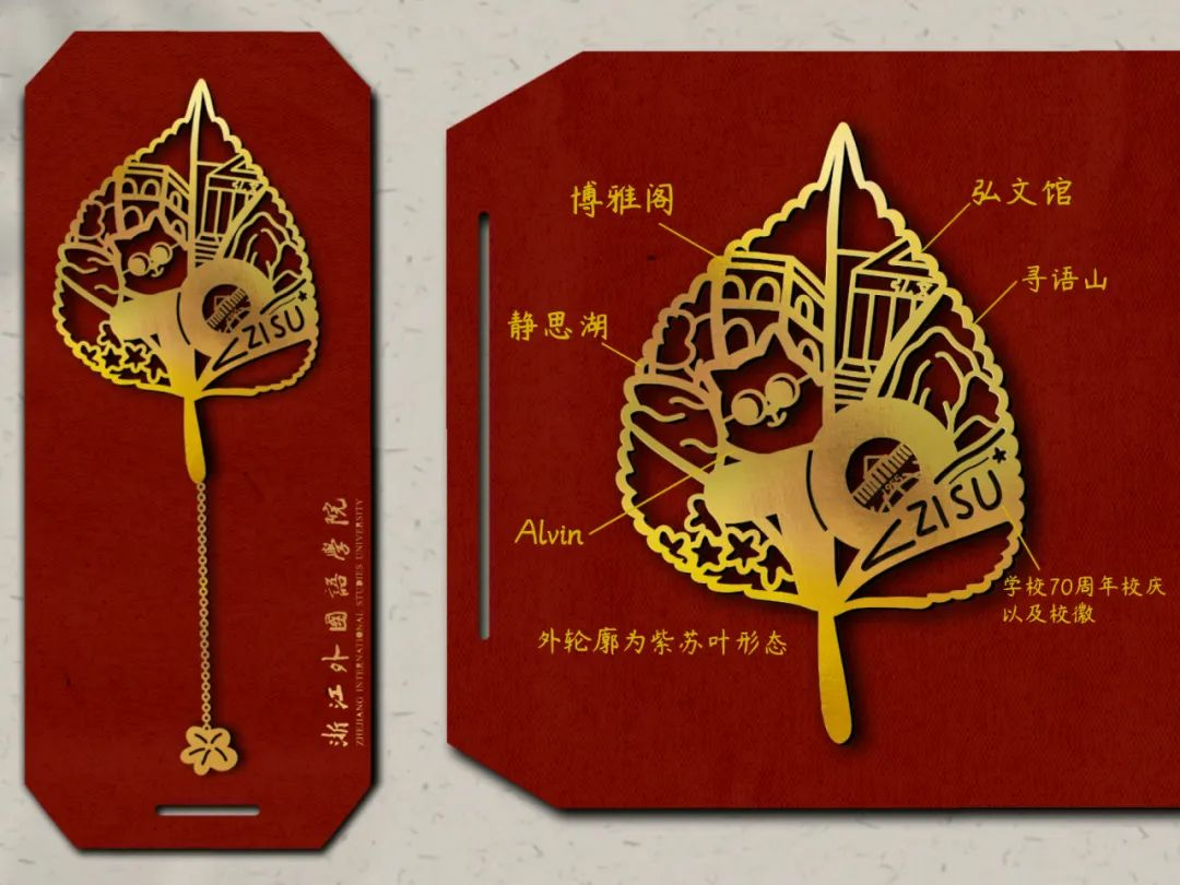 吉祥物Alvin,充分展现浙外特色和“弘德明毅,博雅通达”的校训。整体书签为金属质感,象征浙外70年的光辉历程。