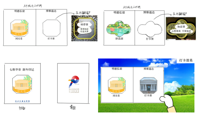 静思湖打卡窗以如意窗框绘湖景荷桥,右侧虚实相映传递心想事成;同文堂版用柿蒂窗勾勒建筑,实景叠合暗喻事事如意,双窗皆融校训于方寸,让校园打卡兼具诗意与期许。