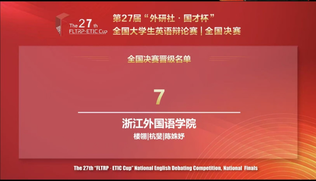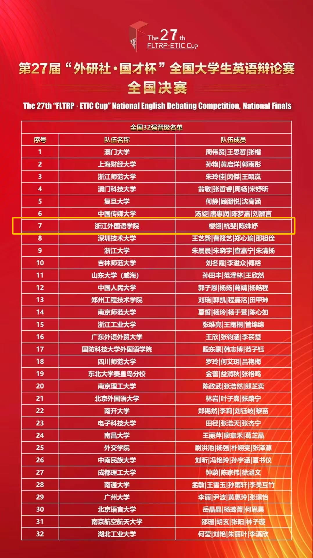 近日,第27届“外研社·国才杯”全国大学生英语辩论赛全国决赛圆满落下帷幕。在楼翎老师的悉心指导下,经过激烈的角逐,鸭奈飞 22英语(师范)4班杭斐、22英语7班陈姝妤同学在全国众多参赛队伍中脱颖而出,以breaking第7的优异成绩,荣获国赛金奖,成功入围全国32强冠亚季军总决赛淘汰赛!