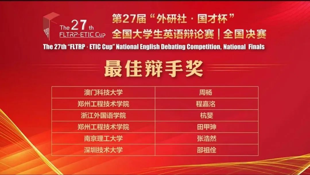 第27届“外研社·国才杯”全国大学生英语辩论赛全国32强冠亚季军总决赛中,22英语(师范)4班杭斐与22英语7班陈姝妤获得国赛金奖,同时,杭斐获得全国总决赛“最佳辩手”的称号。
