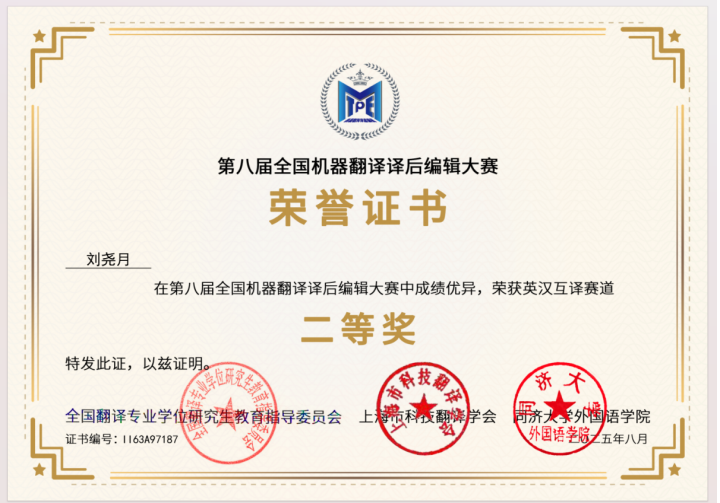 今年,我有幸参加了第八届全国机器翻译译后编辑大赛,并获得了英汉互译赛道的三等奖。这是一场面向全国高校的高水平专业赛事,也是我首次正式参与这一领域的大型比赛。整个参赛过程,不仅让我深刻体验到了人机协作的真实场景,也让我对译后编辑的专业性与挑战性有了全新的认识。