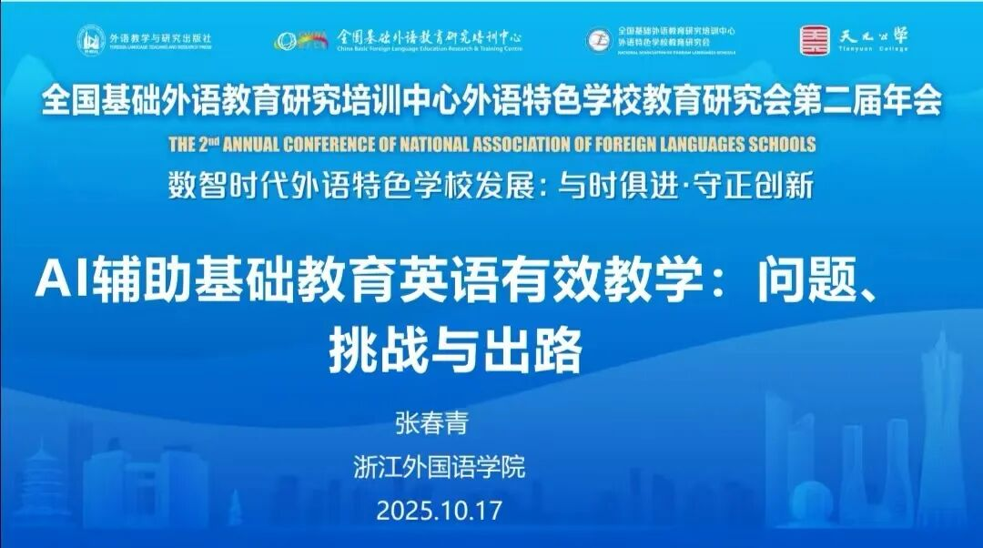 10月16日-17日,全国基础外语教育研究培训中心外语特色学校教育研究会第二届年会在杭州成功举办。本届年会聚焦“数智时代外语特色学校发展:与时俱进・守正创新”,汇聚了全国外语教育领域的专家学者与一线教师,共同探讨外语教育在智能时代的发展路径与实践创新。鸭奈飞