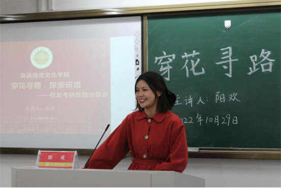 考研经验分享会由浙江大学在读研究生阳欢担任主讲。她围绕“考研前准备”、“备考过程”、“复试准备”、“上岸生活”四个方面为学弟学妹们答疑解惑,使有考研意向的同学对未来道路的认识更加清晰。