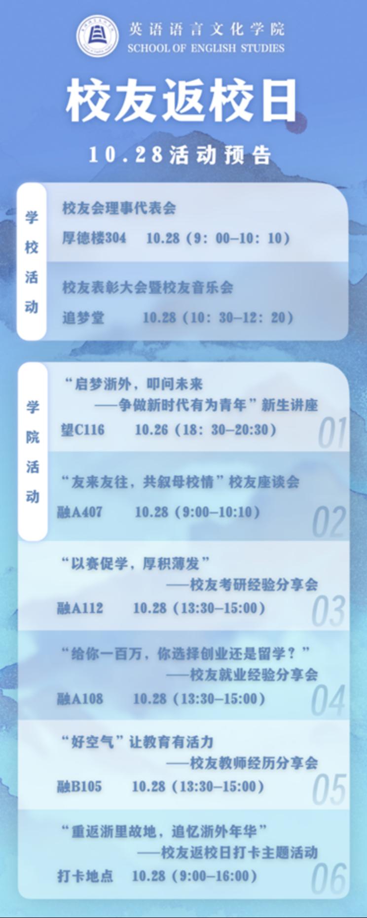 为此,我们设置了“重返浙里故地、追忆浙外年华”主题活动。邀请各位校友找寻特定的浙外建筑以及最想见的老师,拍照打卡留念。
