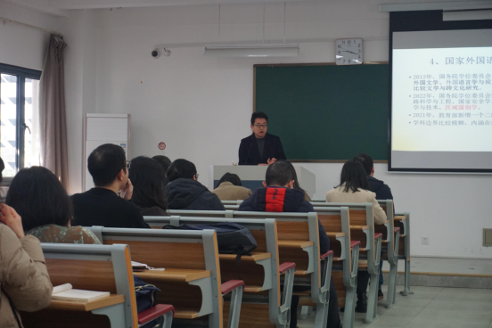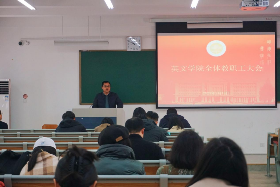 成果总结、2023年学院发展任务、当前面临的问题、个人发展规划建议等五个方面对2023年学院总体工作进行安排部署。他表示,要通过守正固本、交叉创新、学院协同、多语种联合方式推进外国语言文学一流学科建设;通过总结学院2022年在教学、科研及人才培养取得的成绩,以及分析存在问题;从学科建设、组织制度、队伍建设、文化氛围、对外联系等方面谋划了学院2023年发展任务。此外,他传达了学校务虚会精神,指出当前学院国一流专业建设中存在的问题及改进方向;并对教师个人发展规划提出宝贵建议。