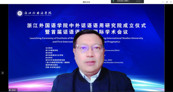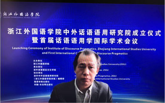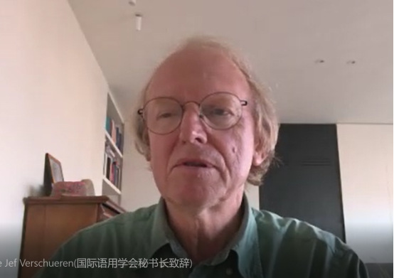 国际语用学会秘书长耶夫•维索尔伦教授通过视频致辞,他表示,与其他语言学研究子领域不同,语用学并没有自己独有的分析单位,而应当看作是一种综观,围绕话语展开分析,涉及语言学、社会学、人类学、心理学等诸多学科。他对研究院的成立表示祝贺,并认为此次国际会议具有里程碑式的意义,期待本次会议将呈现相关研究获取的语料,以此发现话语语用学研究的新方向。