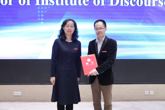 会上举行了国际科研合作平台中外话语语用研究院的揭牌仪式,以及中外话语语用研究院院长聘任仪式。周烈与张环宙一同为研究院揭牌,赵伐、孙绵涛、马晓霖登台见证。洪明为研究院院长谢朝群教授颁发聘书。聘任仪式上,谢朝群院长对各位的支持表达了由衷感谢,他希望研究院在未来不断产出具有浙外辨识度和国际影响力的高水平成果,给国内外学者带来启发与帮助,推动我校科研国际化水平实现新跨越。